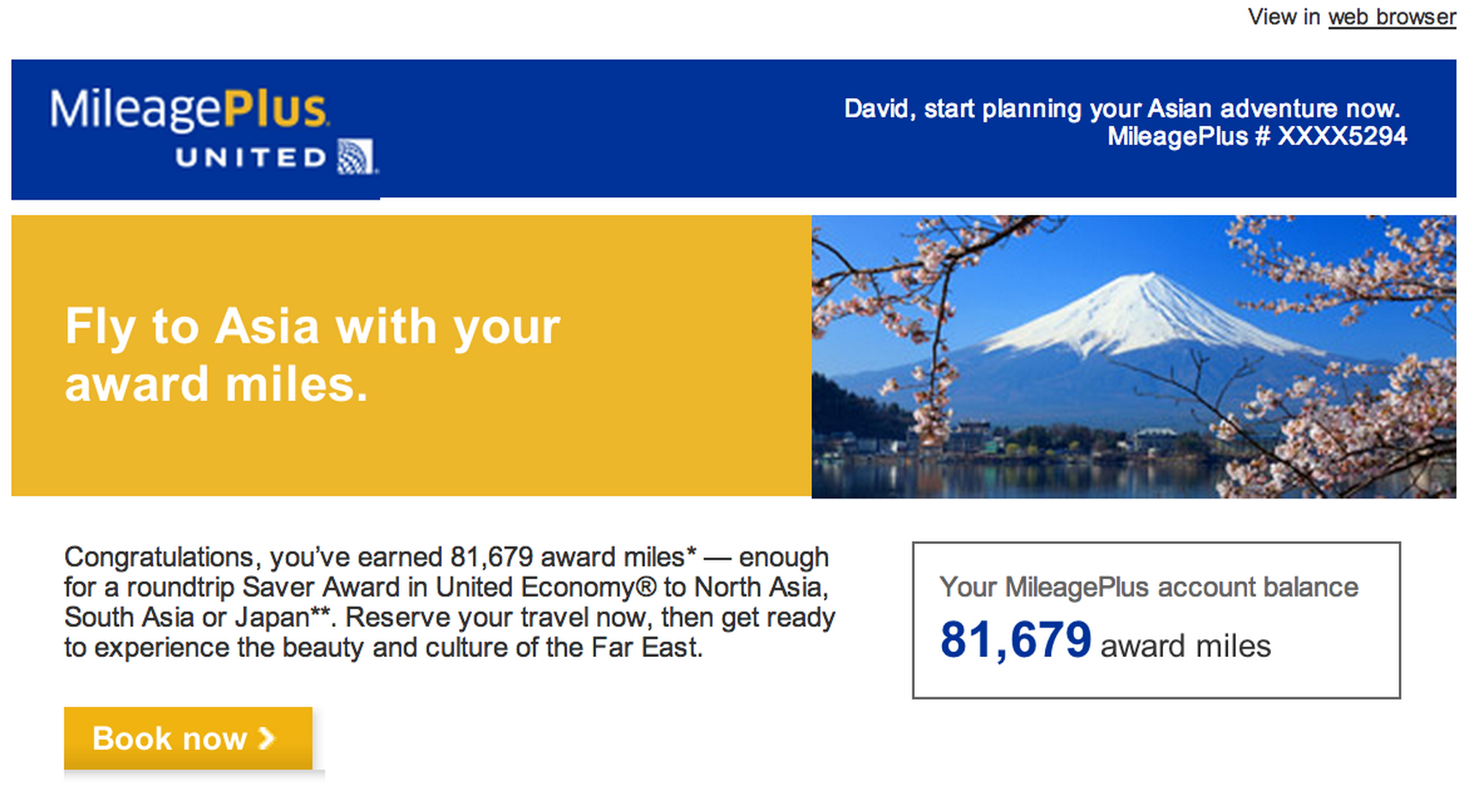 November 16, 2012 by stefparks How Did They Know! Dave got an email from United today with the subject “Pack your bags. You’ve earned enough miles for award travel to Asia!” How did they know!?! Share this: Click to share on X (Opens in new window) X Click to share on Facebook (Opens in new window) Facebook Click to share on Pinterest (Opens in new window) Pinterest Click to share on LinkedIn (Opens in new window) LinkedIn Click to share on Tumblr (Opens in new window) Tumblr Like Loading... Related