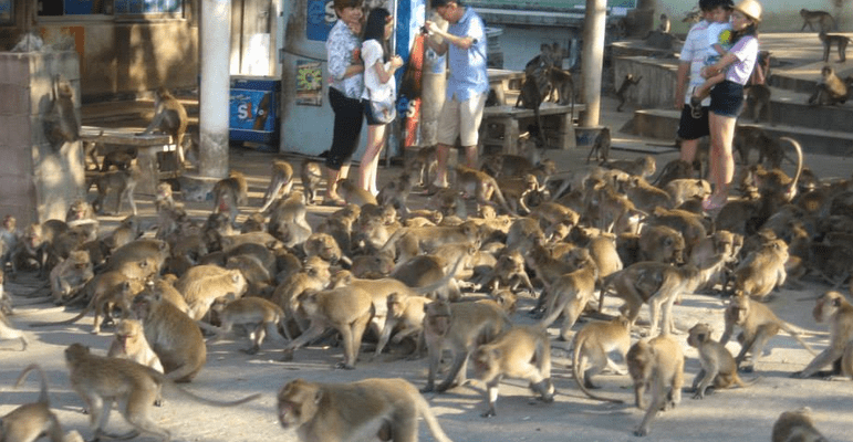 We asked our driver if instead of dropping us off back in the city center, he could instead take us to Chopsticks Hill (Khao Takiab) or what is better known as Monkey Temple (and for good reason!). It’s a large hill at the Southernmost tip of Hua Hin, which you climb, check out the temple built on the top, and get a great view of the entire beach. The climb was nothing strenuous, and the view at the top was definitely worth it. Not only was there a great view of the beach, we also got to see literally hundreds of monkeys running around waiting to be fed. I stood back, but of course, Dave wanted to get a picture and almost got attacked by one of them! Very cool sight but definitely a little scary too.
