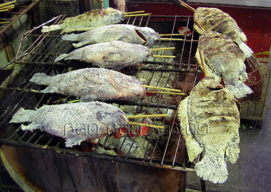 - Whole Grilled Fish: You will see these all over the place. They are huge fish being roasted/grilled on big BBQs. They are served whole and seasoned with salt covering the skin. There are usually cooked with a bundle of lemongrass and other herbs inside of them to add to the flavor.